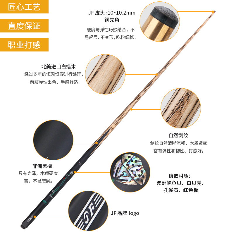 JSK-1608 JF风云系列-返璞 小头中式黑八桌球杆斯诺克通杆黑8球杆